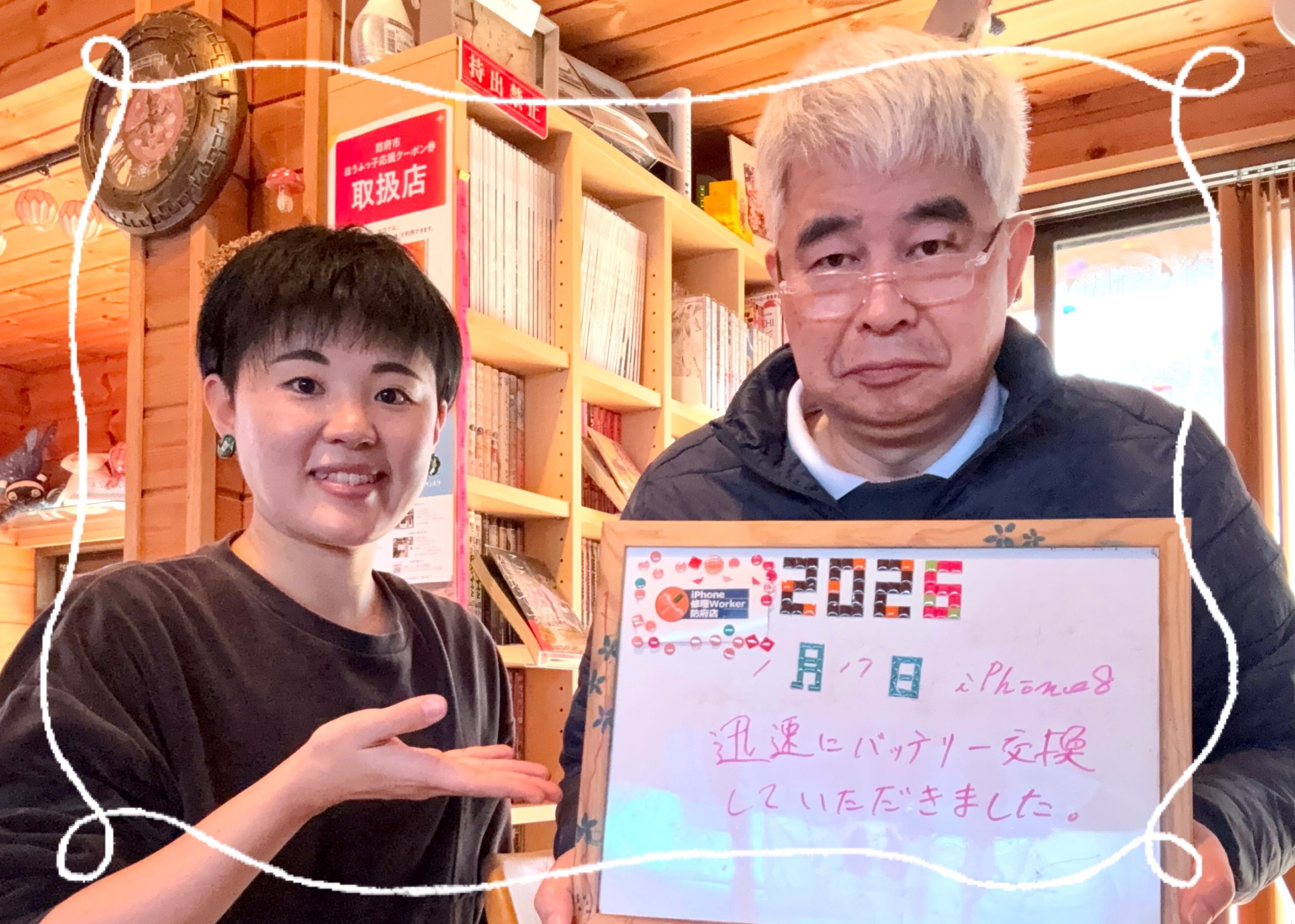 iPhone修理Worker防府店 |防府市本橋町で元女性自衛官が修理します!| 2026.02.11 電話無料相談(10~21時) 0835-68-9220 お客様の声と評価 当店では『顔の見える修理店』の安心感、『お客様満足度』を重視しています。☟口コミありがとうございます! Google 583件 評価4.9 5/5 Yahoo!マップ 411件 評価4.88 4.8/5 エキテン 93件 評価4.88 4.8/5 最安修理.com 99件 評価4.92 4.9/5 メニュー・割引き一覧 お問い合わせ 修理機種一覧 その他ご提案 予約割写真+感想割引き学生割口コミ割引リピート割ペア割 TOPICS 2月の店休日 2026.2.11 防府店ブログ更新しました 2025.2.7 修理事例を掲載しました 2026.2.2 お客様の声を更新しました 当店に寄せられたQ&A公開中!閲覧には下記をタップ▼ iPhone修理Worker防府店について ネット予約する 2021年5月初旬、防府市本橋町(佐波川近く)の古民家でiPhone専門修理のお店をオープンしました。修理担当者は、陸上自衛隊ヘリコプター整備をしていた元・女性自衛官。令和生まれ2児の母であり、子ども達と共に明るくお客さまをお迎えします。約7年間のヘリ整備技術を応用した、iPhoneの液晶画面修理・バッテリー交換・水没修理などに自信があり、即日修理・即日返却を基本としています。店内には修理の待ち時間を楽しく過ごす為のキッズスペース・漫画コーナー・クライミング壁・トイレを完備。駐車場は最大およそ3台分のスペースがあるので、ご家族で気軽にお越しください。当店は不定休ながら、営業日は10時~22時(LO.21時)の業界屈指の長時間営業。お仕事帰りの時間帯や、急な故障・不具合に柔軟に対応可能!子ども達のお迎え時間と被らないように夕方以降のご来店は、事前にお電話・SNS・ネット等でご相談いただけると幸せます。お休みの日時はTOPICSまたはSNS(Twitter)をご参照ください。\ SNSふぉろーみー! / Line Twitter-square Camera 防府店アクセス 店舗名iPhone修理Worker 防府店住所〒747-0041山口県防府市本橋町13-3電話番号0835-68-9220営業時間10:00~22:00 (18:00以降はネット・公式LINE・電話予約で対応可、最終受付21:00)アクセスJR防府駅より車で約6分JR防府駅より徒歩約20分 LINEで質問する お支払方法一覧 その他ご提案 電話無料相談(10~21時) 0835-68-9220 iPhone修理対応機種 iPhone16e iPhone16ProMax iPhone16Pro iPhone16Plus iPhone16 iPhone15ProMax iPhone15Pro iPhone15Plus iPhone15 iPhone14ProMax iPhone14Pro iPhone14Plus iPhone14 iPhone13ProMax iPhone13Pro iPhone13 iPhone13mini iPhone12ProMax iPhone12Pro iPhone12 iPhone12mini iPhone11ProMax iPhone11Pro iPhone11 iPhoneXR iPhoneXSMax iPhoneXS iPhoneX iPhoneSE3 iPhoneSE2 iPhone8Plus iPhone8 iPhone7Plus iPhone7 iPhone6sPlus iPhone6s iPhone6Plus iPhone6 iPhoneSE1 iPhone5s/5c/5 ガラスコーテイング iPad/iPod touch iPhone16 e 修理内容通常価格割引特価作業時間ガラス割れ修理20,650円19,000円40分液晶交換25,650円24,000円40分有機EL交換36,650円35,000円40分バッテリー交換要相談要相談40分水没修理8,300円6,650円90分充電コネクタ修理21,150円19,500円90分フロントカメラ修理20,750円19,500円40分バックカメラ修理28,550円26,900円40分スピーカー修理14,750円13,100円40分バイブレーター修理12,750円11,100円40分カメラガラス割れ修理8,150円6,500円40分 iPhone16 ProMax 修理内容通常価格割引特価作業時間ガラス割れ修理37,850円36,200円40分液晶交換42,850円41,200円40分有機EL交換52,850円51,200円40分バッテリー交換19,650円18,000円40分水没修理8,300円6,650円90分充電コネクタ修理21,150円19,500円90分フロントカメラ修理26,650円25,000円40分バックカメラ修理28,550円26,900円40分スピーカー修理14,750円13,100円40分バイブレーター修理12,750円11,100円40分カメラガラス割れ修理8,150円6,500円40分 iPhone16 Pro 修理内容通常価格割引特価作業時間ガラス割れ修理31,650円30,000円40分液晶交換36,650円35,000円40分有機EL交換41,650円40,000円40分バッテリー交換19,650円18,000円40分水没修理8,300円6,650円90分充電コネクタ修理21,150円19,500円90分フロントカメラ修理20,750円19,500円40分バックカメラ修理28,550円26,900円40分スピーカー修理14,750円13,100円40分バイブレーター修理12,750円11,100円40分カメラガラス割れ修理8,150円6,500円40分 iPhone16 Plus 修理内容通常価格割引特価作業時間ガラス割れ修理21,650円20,000円40分液晶交換26,650円25,000円40分有機EL交換36,650円35,000円40分バッテリー交換17,150円15,500円40分水没修理8,300円6,650円90分充電コネクタ修理31,150円29,500円90分フロントカメラ修理20,750円19,100円40分バックカメラ修理28,550円26,900円40分スピーカー修理14,750円13,100円40分バイブレーター修理12,750円11,100円40分カメラガラス割れ修理8,150円6,500円40分 iPhone16 修理内容通常価格割引特価作業時間ガラス割れ修理21,650円20,000円40分液晶交換26,650円25,000円40分有機EL交換36,650円35,000円40分バッテリー交換17,150円15,500円40分水没修理8,300円6,650円90分充電コネクタ修理21,150円19,500円90分フロントカメラ修理20,750円19,100円40分バックカメラ修理28,550円26,900円40分スピーカー修理14,750円13,100円40分バイブレーター修理12,750円11,100円40分カメラガラス割れ修理8,150円6,500円40分 iPhone15 ProMax 修理内容通常価格割引特価作業時間ガラス割れ修理20,650円19,000円40分液晶交換25,650円24,000円40分有機